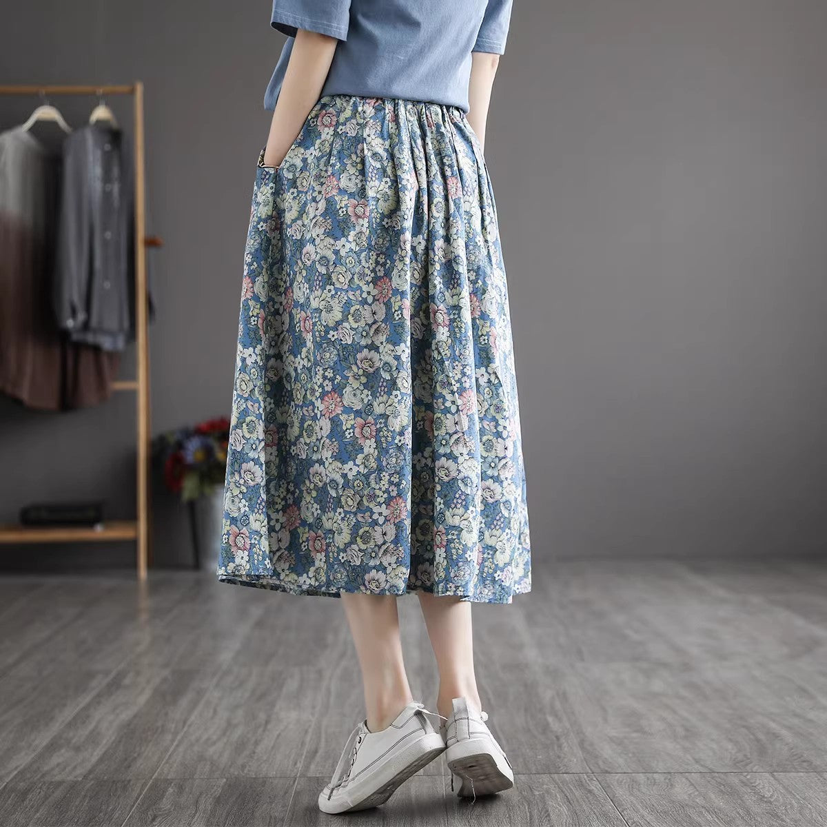 Cotton Floral Elastic Waist Pleated A-Line Skirt