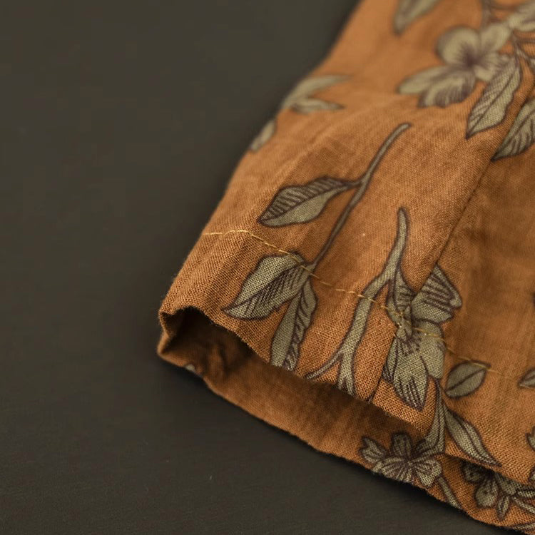 The skirt features a harmonious blend of soft pastels and earthy tones, with blossoms and leaves in shades of brown set against a background of dark orange. This subtle, nature-inspired color palette makes it easy to pair with a variety of tops and accessories.