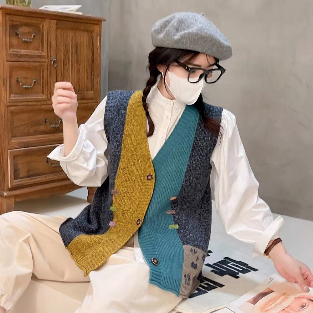 Indulge in this chic color-block V-neck knitted outerwear vest. Its versatile design provides both style and warmth, making it the perfect addition to any outfit. Keep up with the latest fashion trends while staying cozy and comfortable. A must-have for any luxurious wardrobe.
